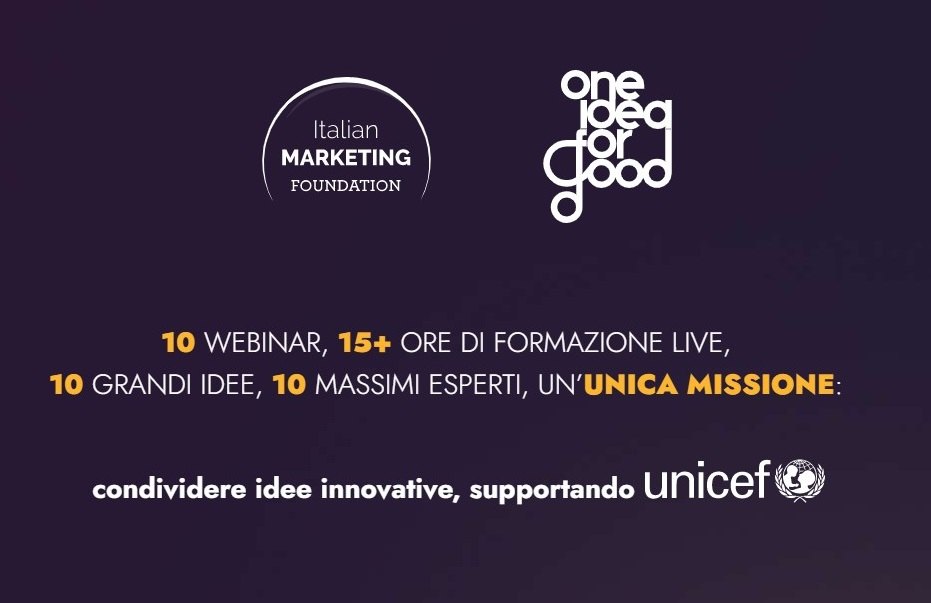 One Idea For Good lancia con Italian Marketing Foundation un ciclo di dieci webinar formativi sulla responsabilità sociale e sul valore condiviso, il cui ricavo totale servirà per sostenere l’UNICEF Italia Esperti del design, dell’economia comportamentale, del management e del marketing condivideranno idee innovative da trasformare in progetti solidali concreti.